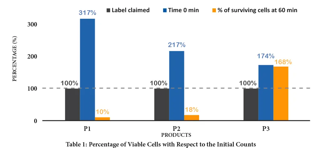 Table 1 shows the percentage of initial viable cell counts and the percentage of cells after 60 minutes of incubation relative to the label claim. Product P3 showed a minimal change in survival rate of 168%, exceeding the label claim. This is attributable to an enteric coating being present on the P3 capsules.