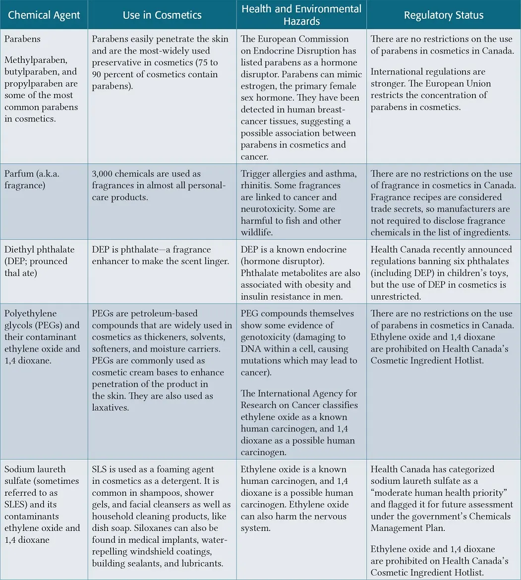 Worse yet, most of the ingredients are permitted for use by Health Canada. The following list of ingredients merely covers a few of the main culprits permitted in body care and beauty products today.