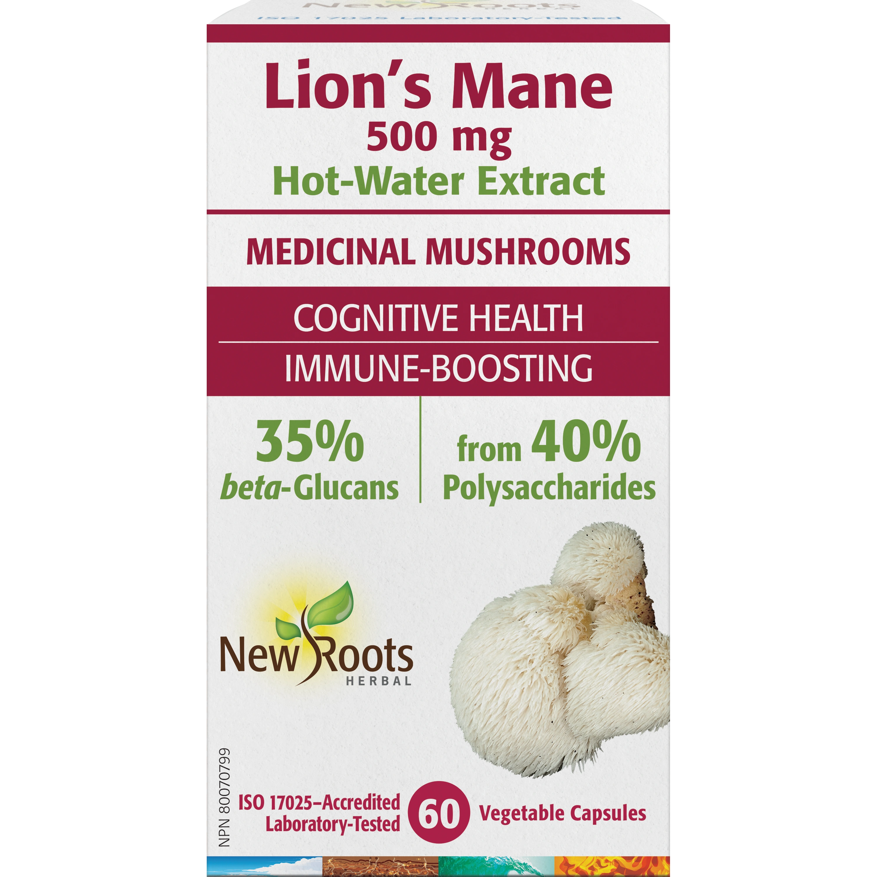 New Roots Herbal’s Lion’s Mane (Hericium erinaceus) is a hot water–extract standardized and potency-validated to contain 40% polysaccharides (500 mg per capsule) with a guaranteed 35% of beta-glucans; clinically researched compounds shown to stimulate immune function and support cognitive health.