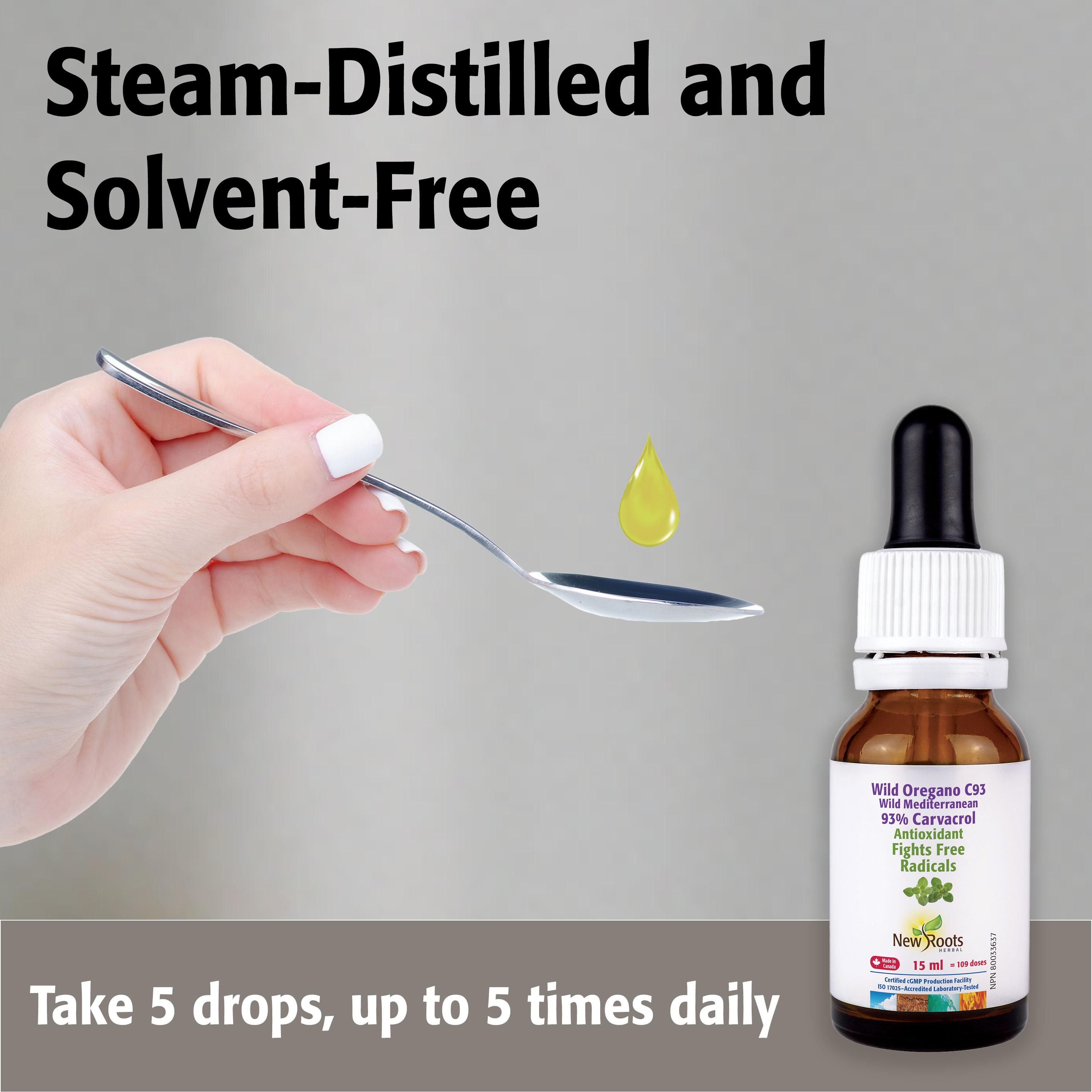 Wild Oregano C93 delivers the essence of wild Mediterranean oregano in its purest form. Hand-picked Origanum minutiflorum is steam-distilled and blended with organic olive oil for a 1:5 ratio, providing 93% carvacrol within its total volatile oilsâa potent source of antioxidants that help support the bodyâs natural defences.